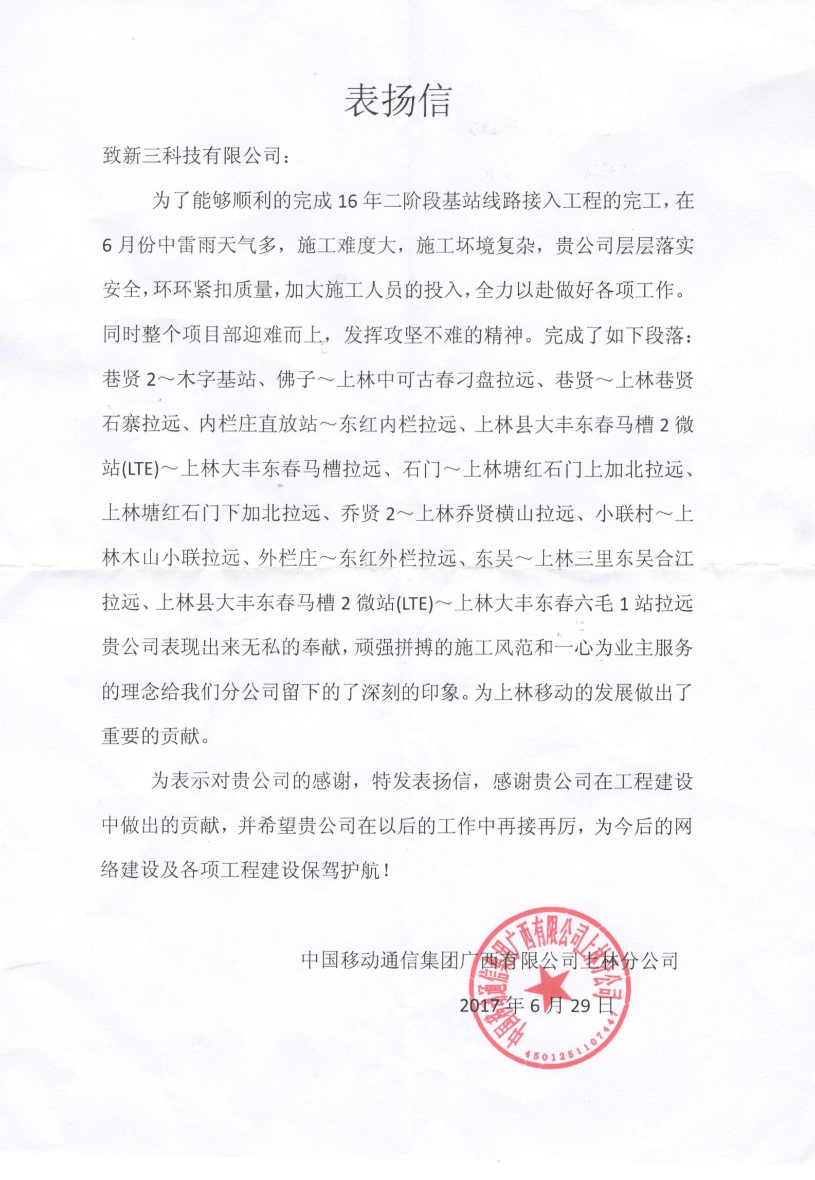 中国移动上林分公司表扬信