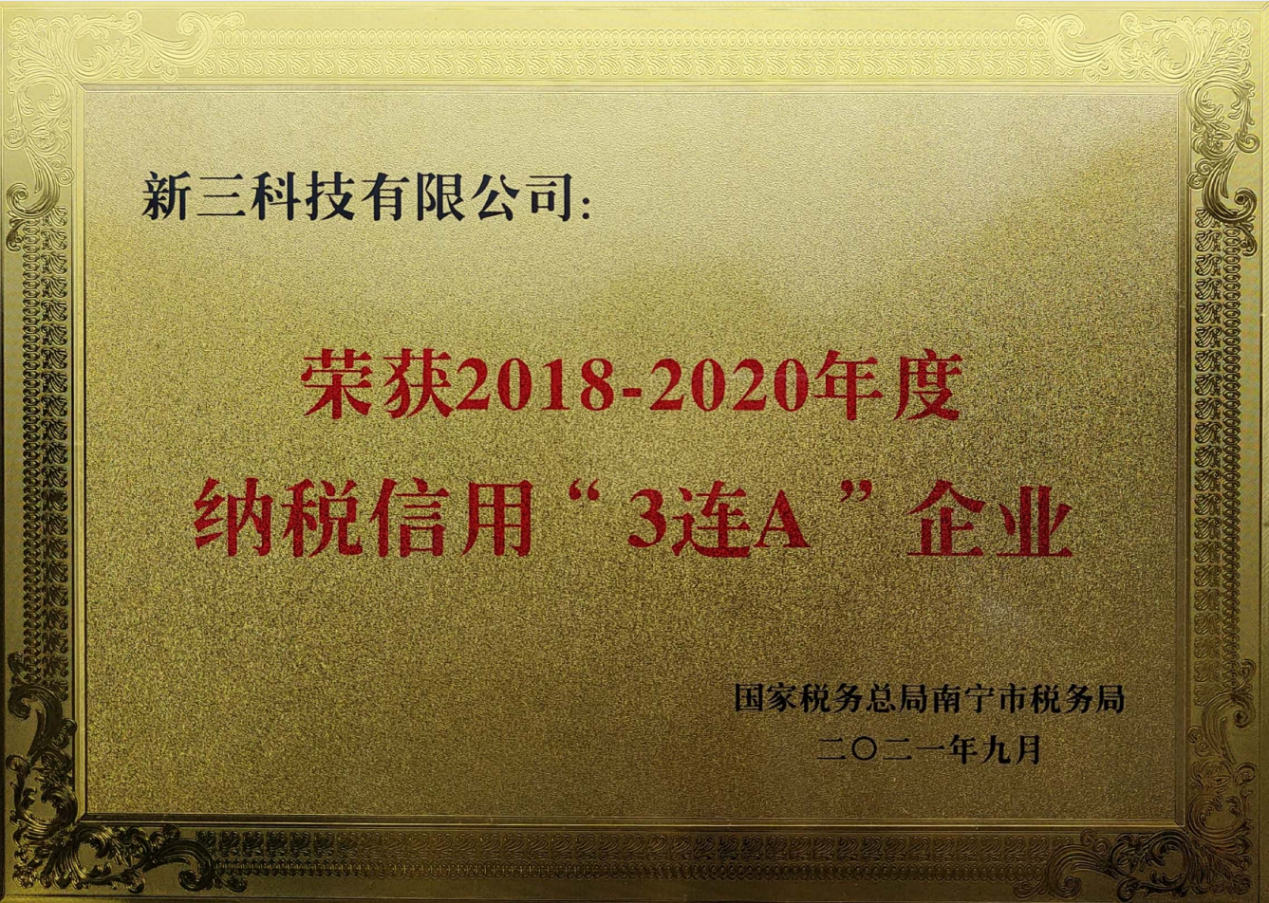 2021年12月30日,国家税务总局南宁市高新区税务局对新三科技进行了线上授匾仪式,公司获评为2018-2020年度国家税务总局南宁市税务局纳税信用“3连A”企业。自2017年起,新三科技已连续4年获评纳税信用A级企业。 一直以来,新三科技秉承诚信经营、依法纳税的理念,自觉遵守税…