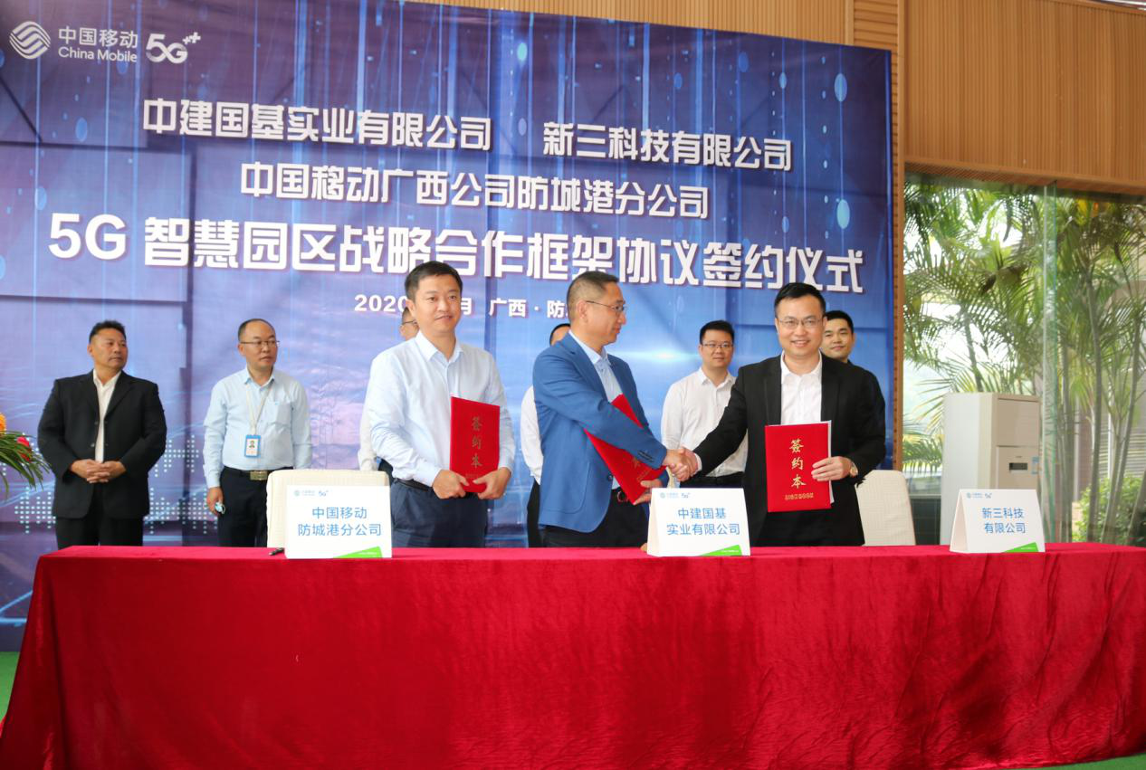 10月29日上午,中建国基实业有限公司、中国移动广西公司防城港分公司、新三科技有限公司举行5G智慧园区战略合作框架协议签约仪式。中建国基实业有限公司查振中董事长、中国移动广西公司陈涛副总经理、新三科技有限公司周军总经理见证5G智慧园区战略合作框架协议--防城港观山观…