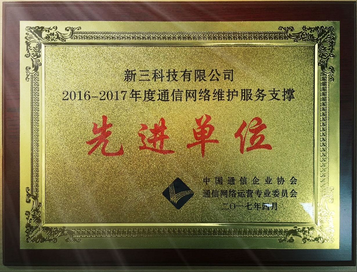 新三科技有限公司凭借在通信领域过硬的通信网络运维技术以及优质的服务质量,荣获“2016-2017年度通信网络维护服务支撑先进单位”奖。