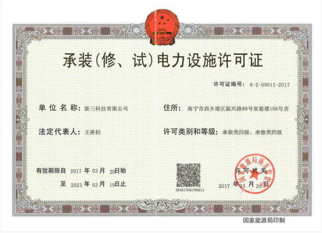 新三科技有限公司喜获《承装(修、试)电力设施许可证》 新三科技有限公司在3月20日获得国家能源局南方监管局授予的《承装(修、试)电力设施许可证》,许可类别和等级为:承装类四级、承修类四级。该级别可承担可以从事 35千伏以下电压等级电力设施的安装、维修或者试…
