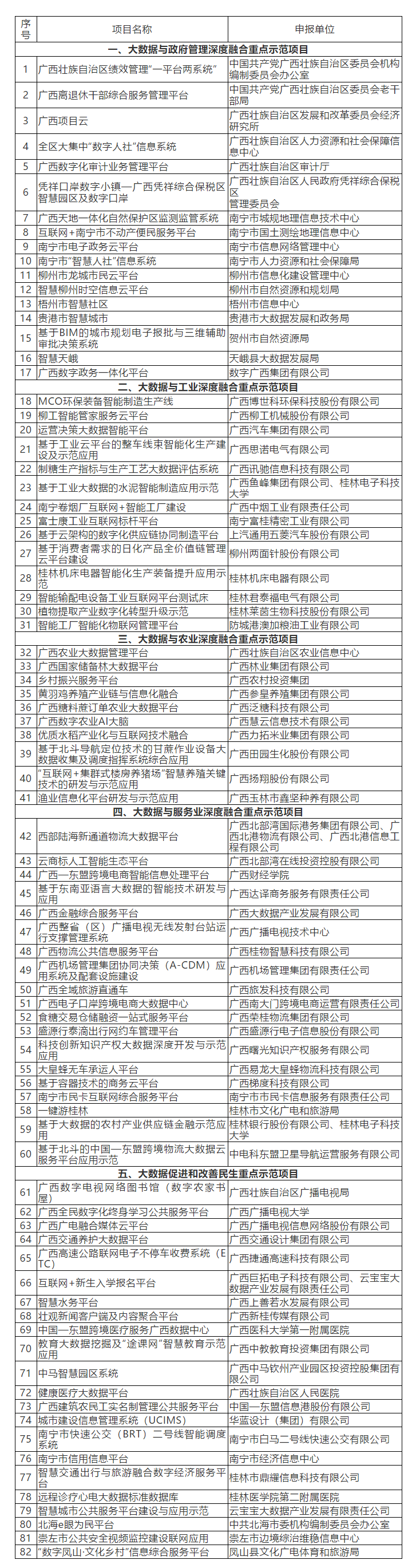 为深入实施大数据战略,加快数字广西建设,根据《数字广西建设领导小组办公室关于印发〈数字广西建设标杆引领行动方案〉的通知》(桂数广办发〔2019〕9号)精神,经自治区各有关部门和各市大数据发展主管部门组织推荐、申报、专家评审及社会公示,现认定 “广西壮族自治区绩效管理‘一平台两系统’”等82个项目为第一批数字广西建设标杆引领重点示范项目,广西宝信迪科技有限公司等23家企业为第一批数字广西建设标杆引领数字经济产业重点示范企业,桂林华为信息产业生态合作区等22个平台为第一批数字广西建设标杆引领重点支撑平台(详细名单附后)。