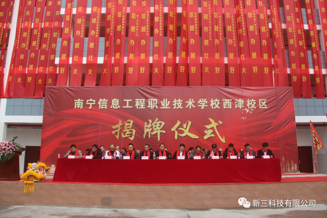 (一)1月11日,新三科技全资打造的南宁信息工程职业技术学校西津新校区揭牌仪式圆满成功。新三科技将继续深化产教融合,加强校企合作,打造从学生定制化培养、项目开发、集中实训到人才输出的完整链条,形成专业规划、教材开发、教学设计、课程设置、实习实训的新型教育模式。