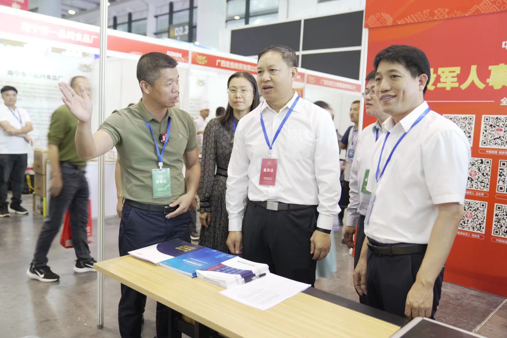自治区退役军人事务厅副厅长彭石山、南宁市退役军人事务局局长刘强业、南宁市退役军人事务局副局长李勤等一行领导来到新三科技展区参观交流,新三科技总裁何东信在现场进行产品介绍。