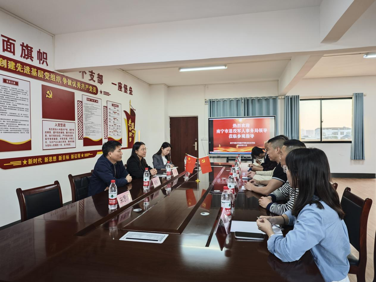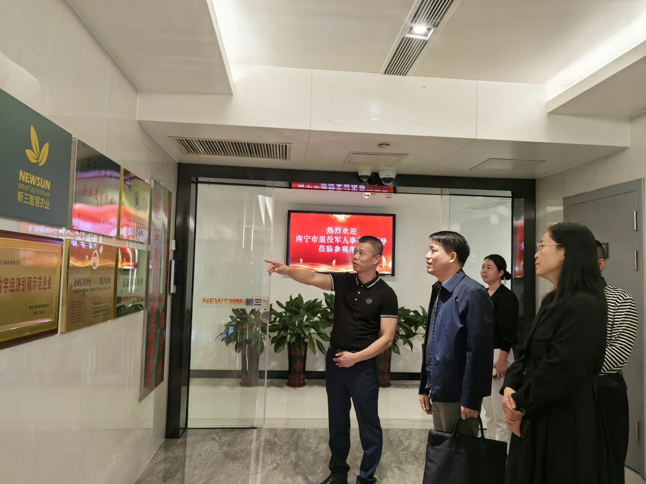 11月20日下午,南宁市退役军人事务局党组书记、局长刘强业,副局长李勤一行莅临新三科技有限公司(以下简称“新三科技”)及由新三科技主办的南宁市数字智能中等职业技术学校(以下简称“数字智能职校”)走访调研指导工作,新三科技总裁何东信,数字智能职校校长陈远盛陪同调研座谈。