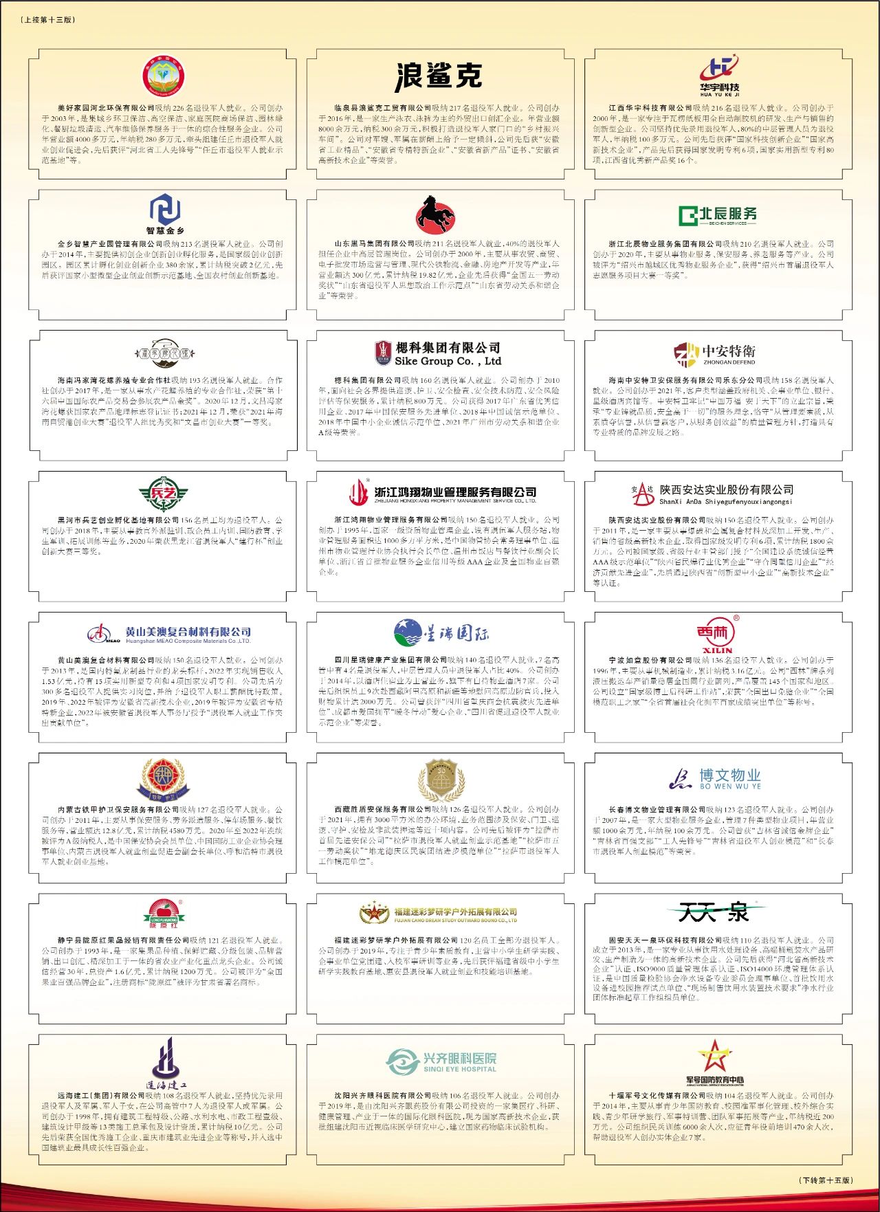 美好家园河北环保有限公司吸纳226名退役军人就业。公司创办于2003年,是集城乡环卫保洁、高空保洁、家庭医院商场保洁、园林绿化、餐厨垃圾清运、汽车维修保养服务于一体的综合性服务企业。公司年营业额4000多万元,年纳税280多万元,牵头组建任丘市退役军人就业创业促进会,先后获评“河北省工人先锋号”“任丘市退役军人就业示范基地”等。临泉县浪鲨克工贸有限公司吸纳217名退役军人就业。公司创办于2016年,是一家生产泳衣、泳裤为主的外贸出口创汇企业,年营业额8000余万元,纳税300余万元,积极打造退役军人家门口的“乡村振兴车间”。公司对军嫂、军属在薪酬上给予一定倾斜,先后获“安徽省工业精品”、“安徽省专精特新企业”、“安徽省新产品”证书、“安徽省高新技术企业”等荣誉。