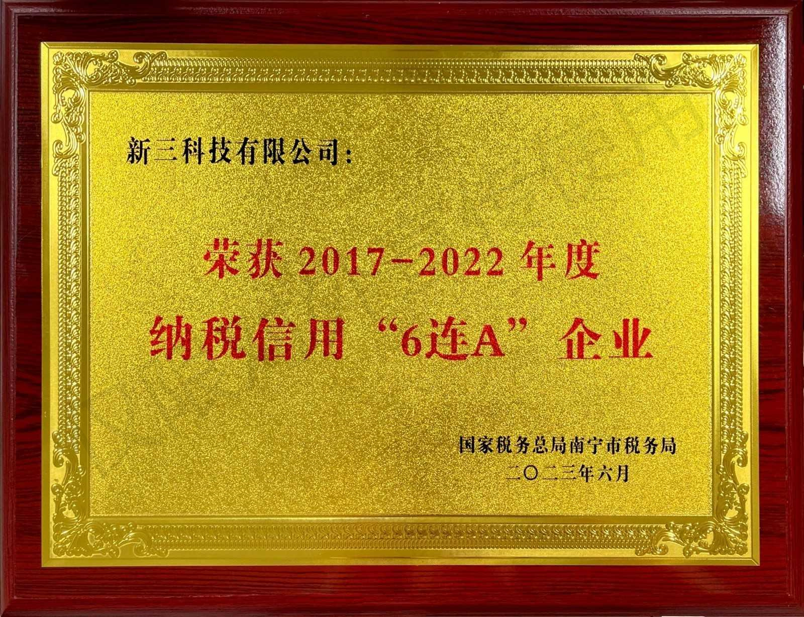 6月,获2017-2022年度纳税信用“6连A企业”荣誉称号。