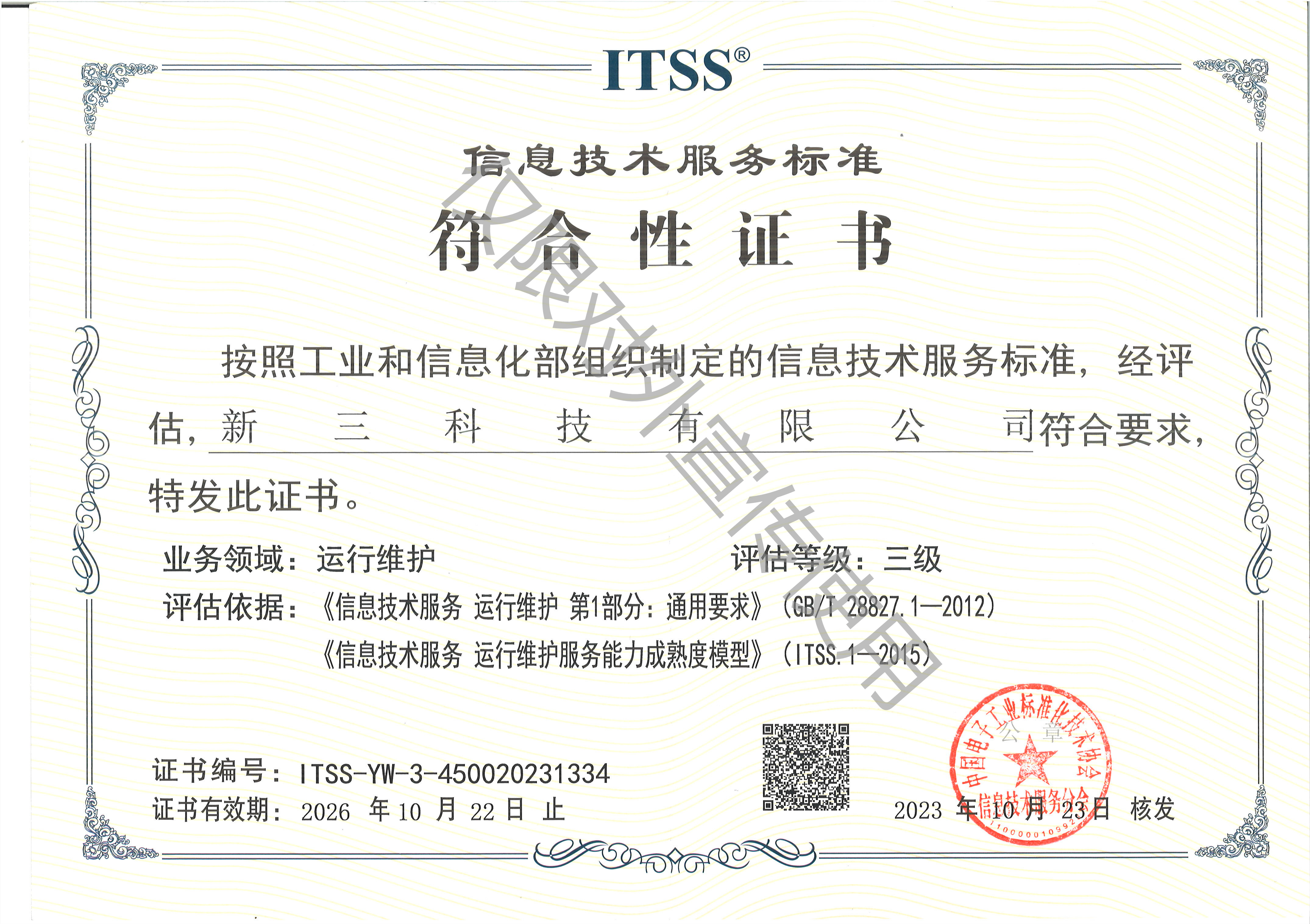 10月,获ITSS信息技术服务标准符合性证书(三级)。