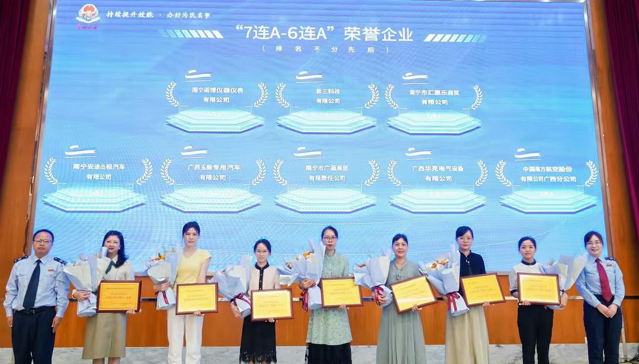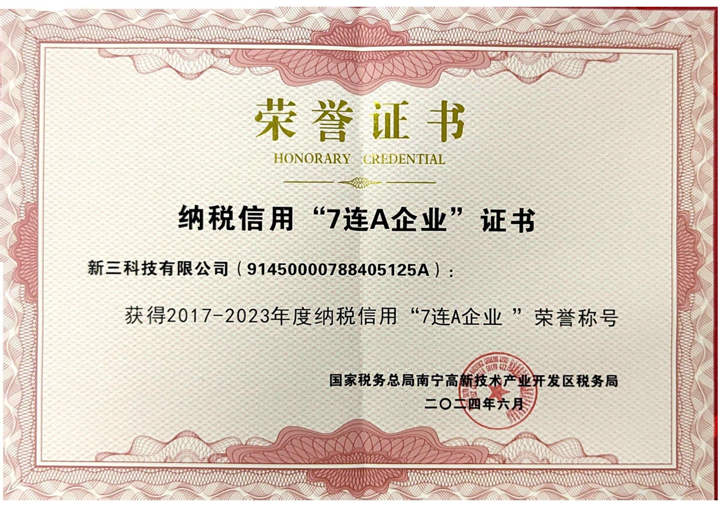8月27日,南宁高新区税务局举办纳税信用“6连A至10连A”企业现场授牌仪式。新三科技获评2017-2023年度国家税务总局南宁市税务局纳税信用“7连A”企业,受邀参加仪式并上台领奖。
