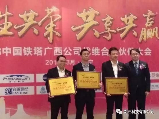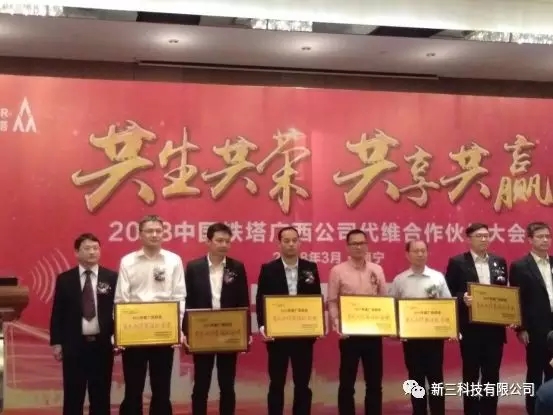 此次会议上新三科技有限公司荣获中国铁塔广西公司颁发的“2017年年度五星级优秀代维合作伙伴”和“发电取信系统配合状”两项荣誉,在此次大会上接受中国铁塔广西公司的表彰!